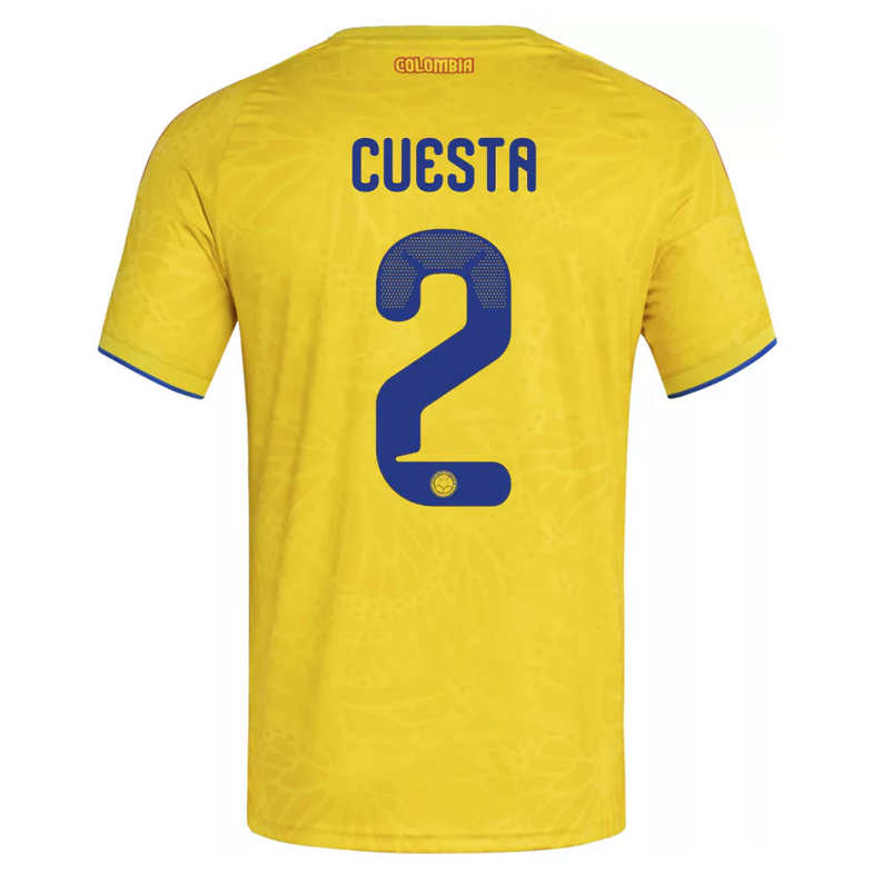 Colombia VM 2026 Hemmatröja bär namnet och numret för Carlos Cuesta, en snabb och stark mittback känd för sin positionssäkerhet, duellstyrka och förmåga att läsa spelet. Ett utmärkt val för fans som uppskattar stabilitet och disciplin i försvaret.