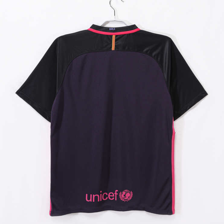 Återupplev Barcelonas 2016/17-säsong med denna retro bortatröja i en iögonfallande lila design. Den unika färgsättningen kombinerar klubbens moderna stil med traditionell identitet, perfekt för supportrar och samlare som vill bära en autentisk retroinspirerad look.