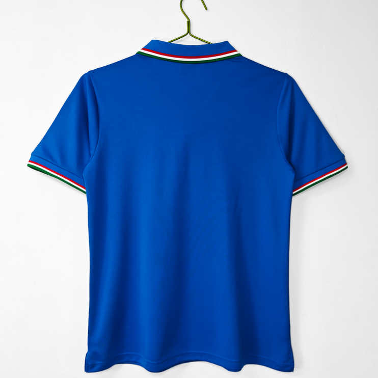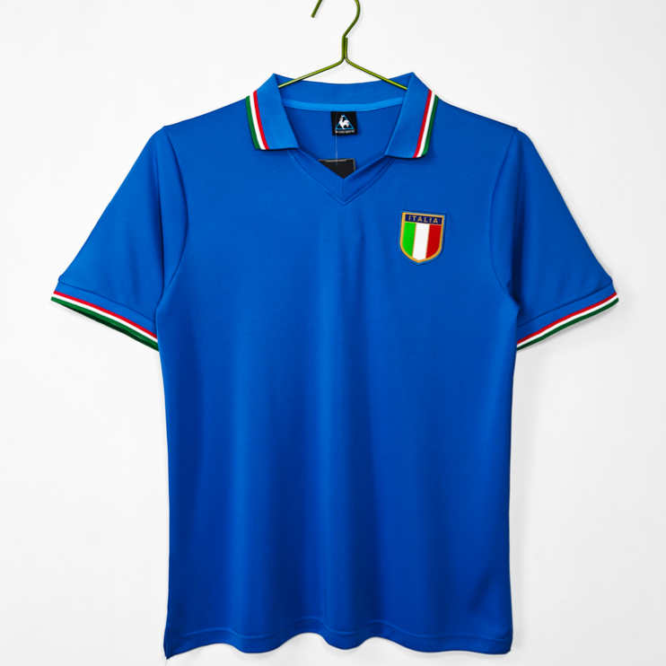Denna Italien hemmatröja 1982 i retrodesign återger de klassiska blå färgerna och autentiska detaljerna från originalmodellen. Perfekt för passionerade fans, samlare och alla som älskar fotbollshistoria och retrostil.