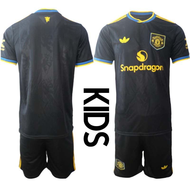 Manchester United Tredjetröja 2025-26 har en svart design med gula och blå detaljer, som hämtar inspiration från den klassiska bortatröjan från säsongen 1993-94.