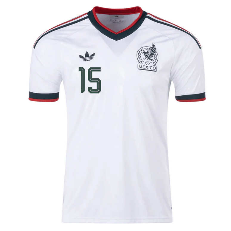 Mexiko VM 2026 Bortatröja lyfter fram dynamiken på högerkanten genom spelaren Rodrigo Huescas. Med nummer 15 på ryggen symboliserar denna tröja snabbhet, arbetskapacitet och offensiv bredd – viktiga egenskaper i det mexikanska landslaget.