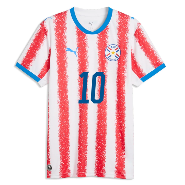 Bär denna Paraguay hemmatröja VM 2026 herr och visa ditt stöd för Paraguay national football team. Denna kortärmade fotbollströja har tryck med mittfältaren Miguel Almirón och hans ikoniska nummer 10 – ett perfekt val för fans som uppskattar snabbhet, teknik och offensivt kreativt spel.