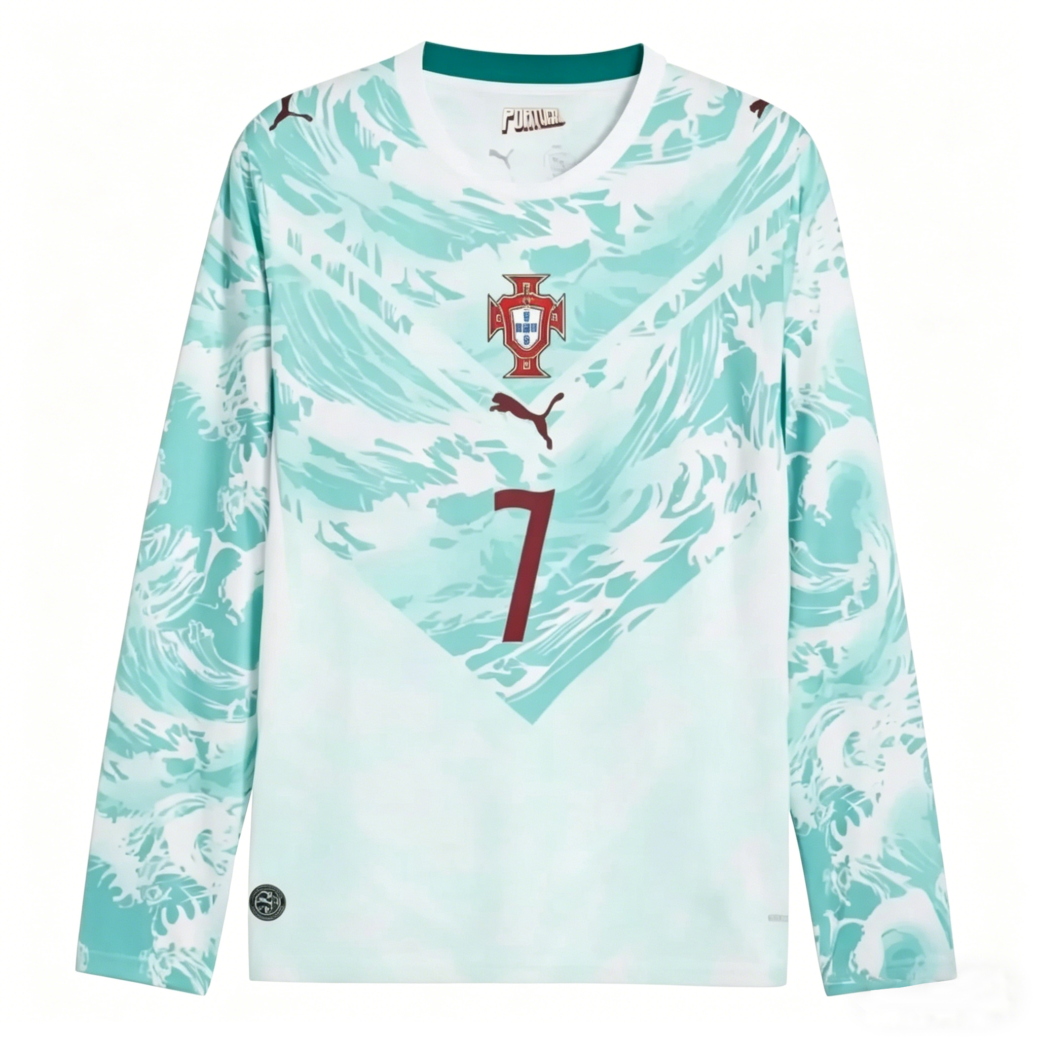 Portugal VM 2026 Bortatröja är tryckt med namnet Cristiano Ronaldo och hans ikoniska nummer 7. Ronaldo är en av fotbollens största legender, känd för sin explosivitet, målfarlighet och starka vinnarskalle. Den långärmade designen ger extra komfort och passar perfekt för matcher i kallare väder samt för fans som vill ha en mer klassisk matchlook.