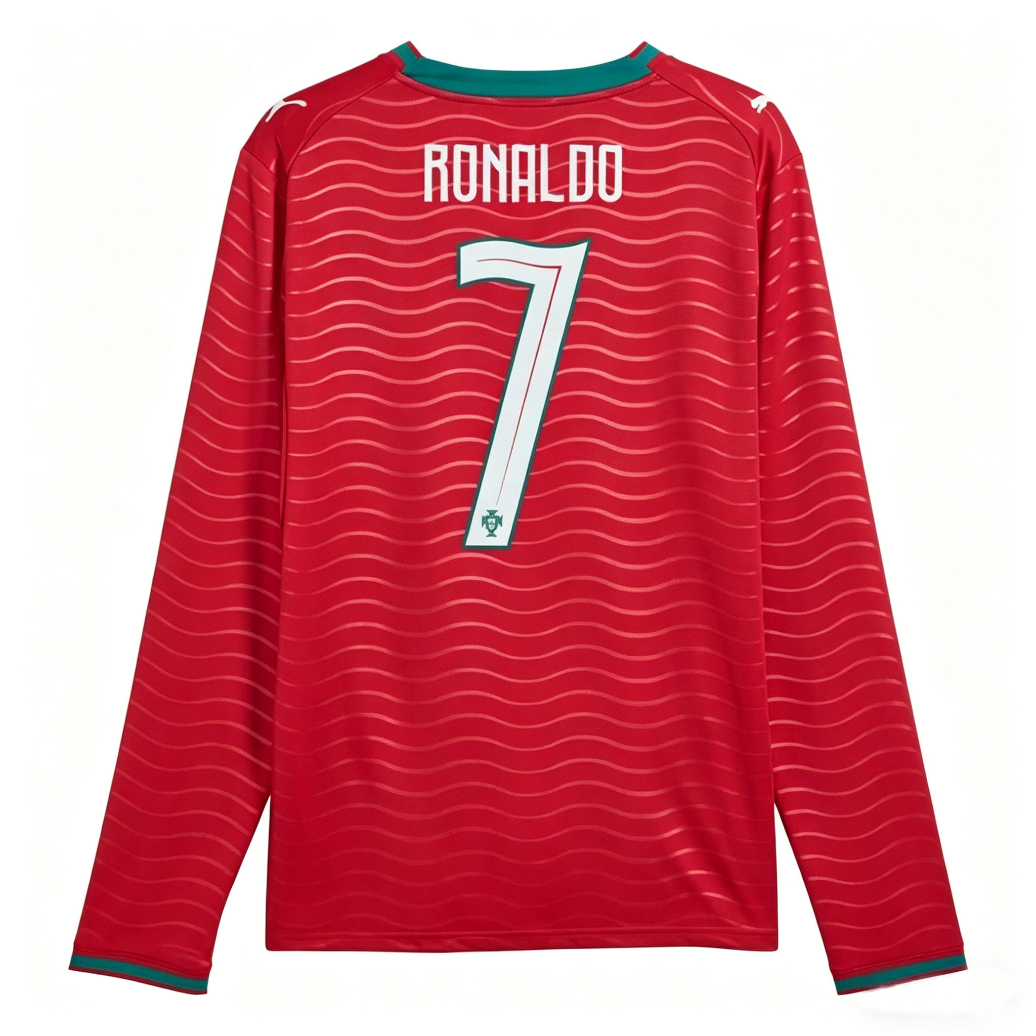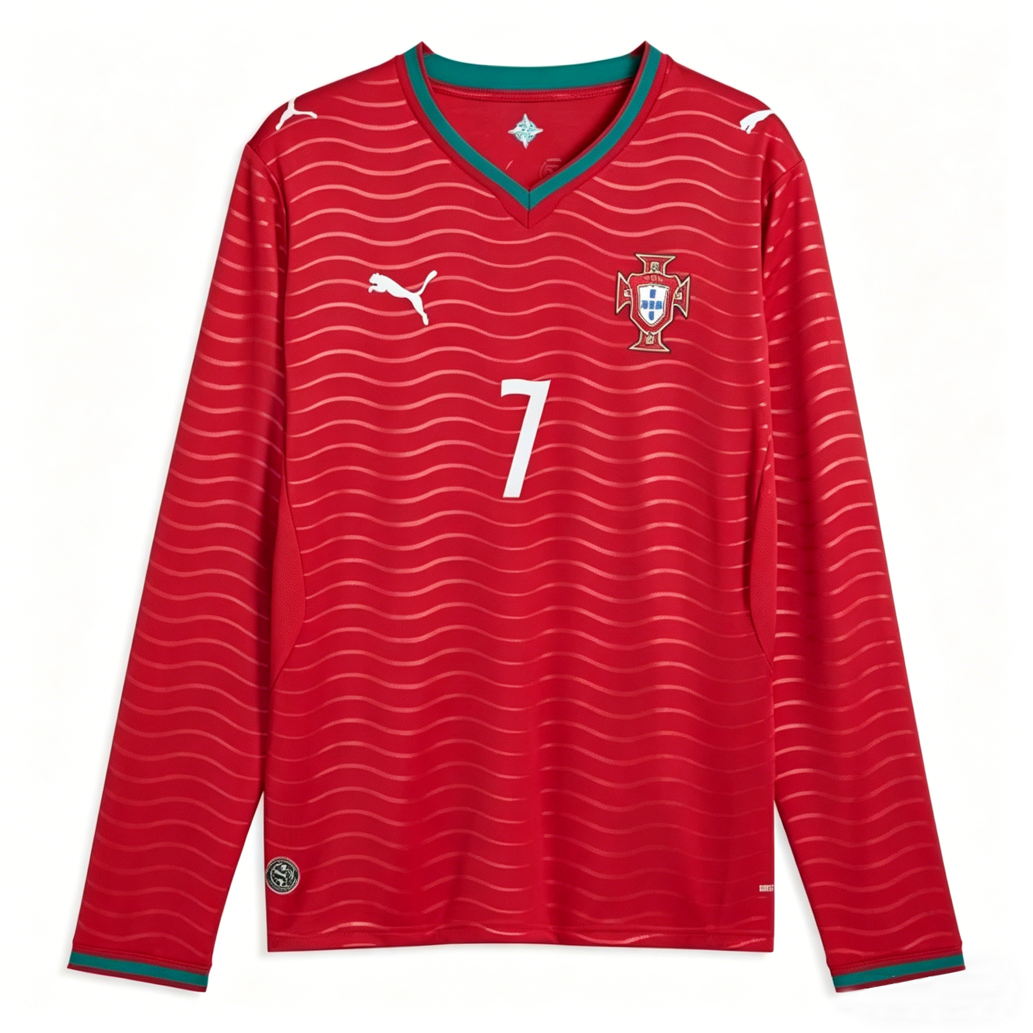 Portugal VM 2026 Hemmatröja är tryckt med namnet Cristiano Ronaldo och hans ikoniska nummer 7. Ronaldo är en av fotbollens största legender, känd för sin målfarlighet, explosivitet och starka vinnarskalle. Den långärmade designen ger extra komfort och är perfekt för kyligare matchdagar samt för fans som vill ha en klassisk och stilren landslagslook.