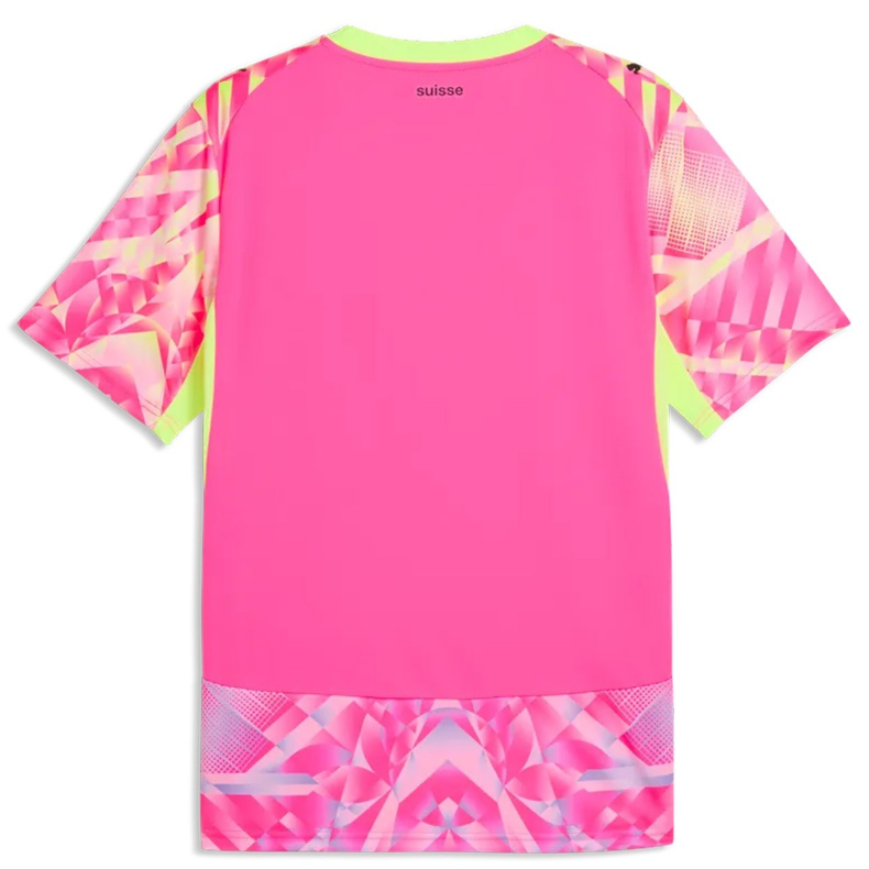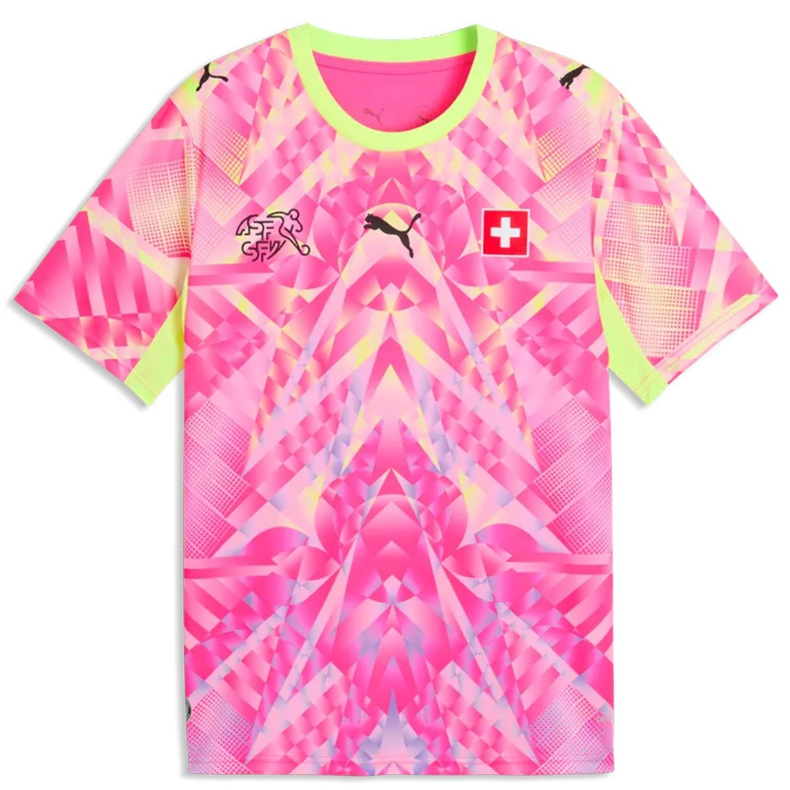 Schweiz 2026 andra målvaktsställ kännetecknas av ett livfullt geometriskt mönster som verkligen fångar uppmärksamheten. Designen domineras av nyanser i rosa, gult och lila, vilket ger tröjan ett energifyllt och unikt uttryck. Den neon-gula rundhalsade kragen tillsammans med matchande paneler under armarna skapar en modern kontrast och förstärker helhetsintrycket.